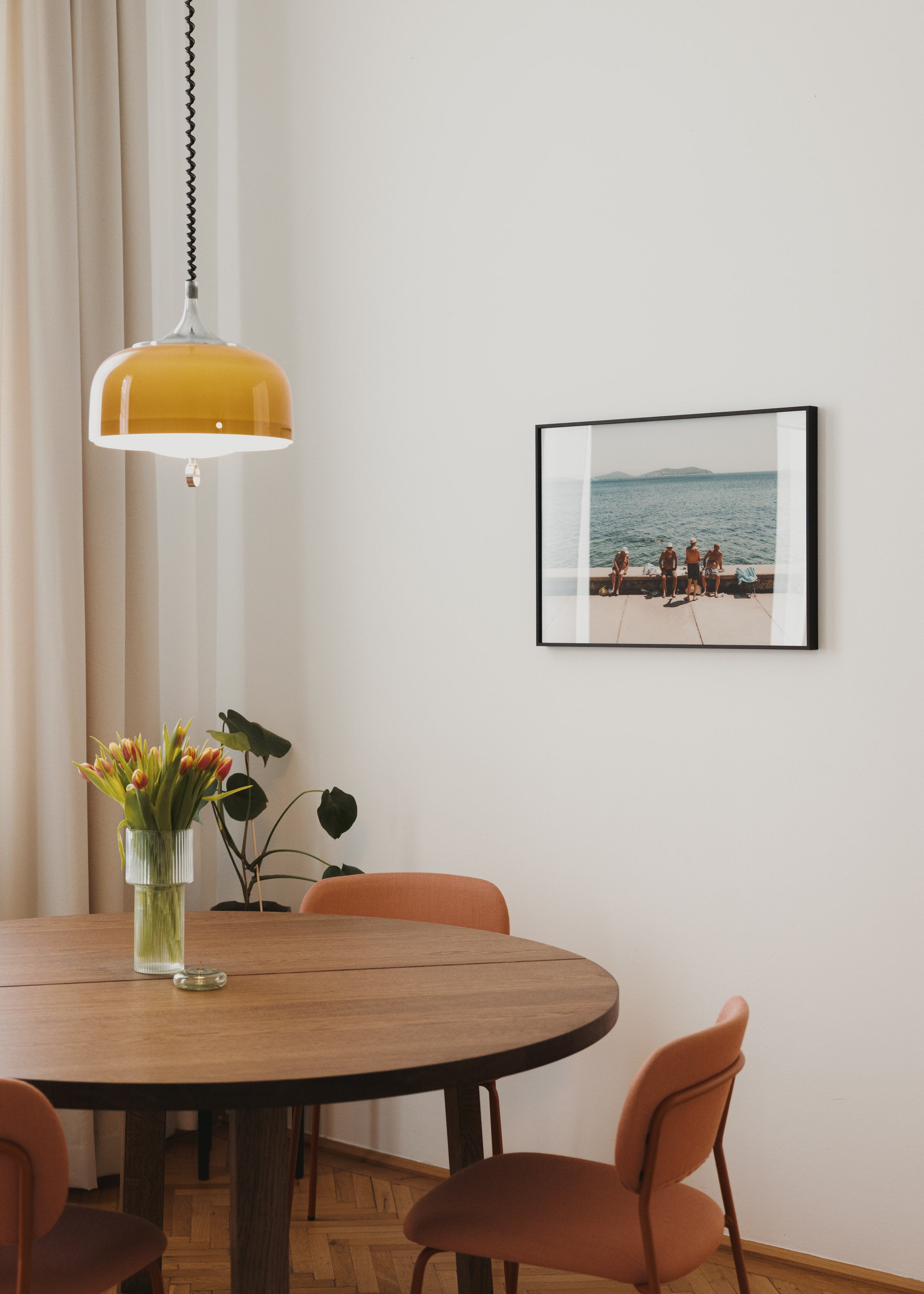 A photography artwork portraying four men gathered at the water’s edge, spending the day talking between waves. Professionally framed and printed in archival quality for lasting depth.