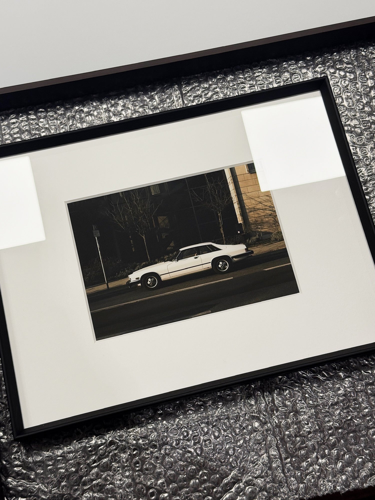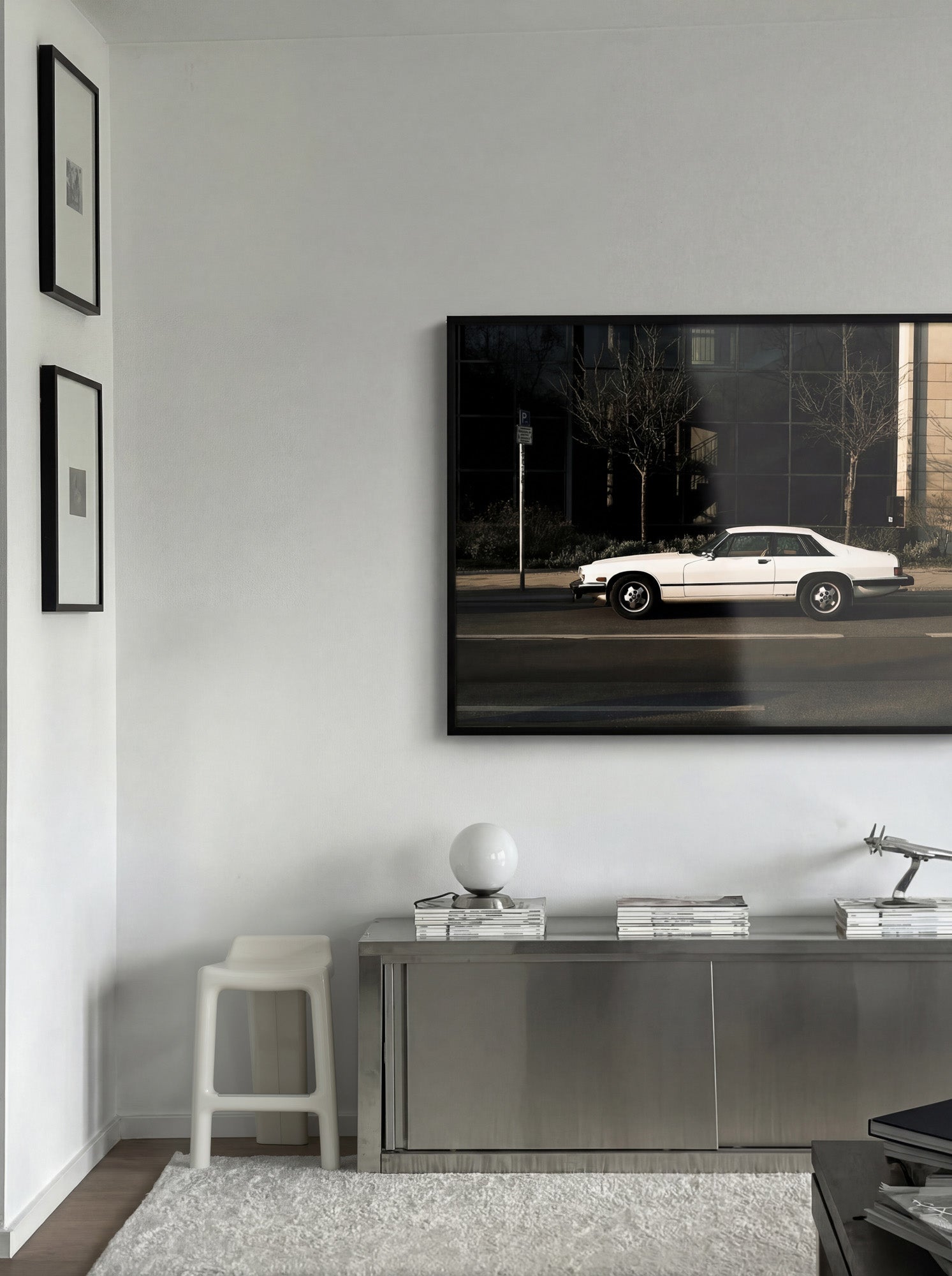 A minimalist fine art photograph of a vintage Jaguar XJ set against contemporary Berlin architecture, produced with archival materials and an elegant handcrafted frame.