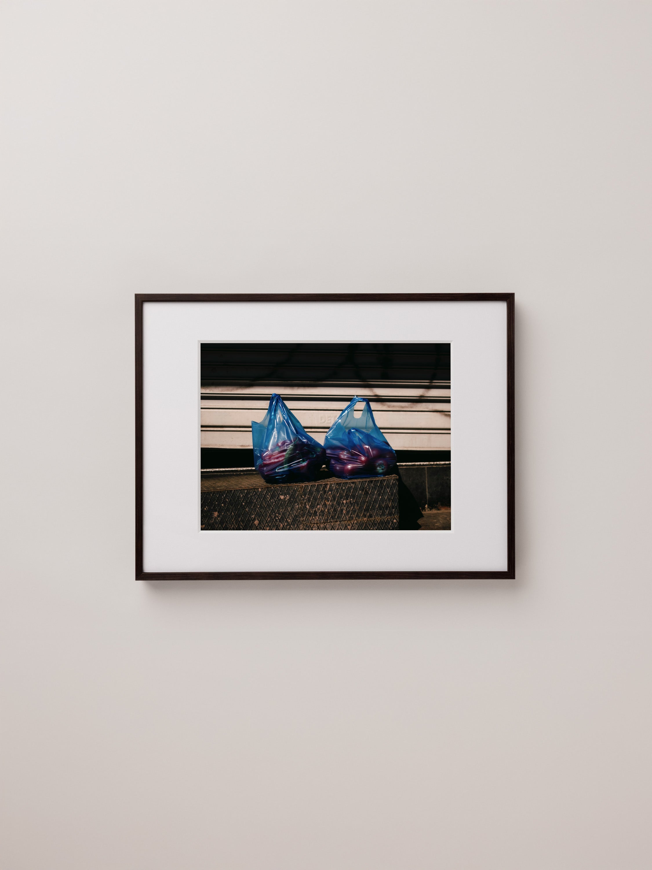 A photography artwork from Istanbul capturing two leftover market bags in the afternoon light. Archival-quality print and handcrafted framing bring subtle character and realism to modern interiors.