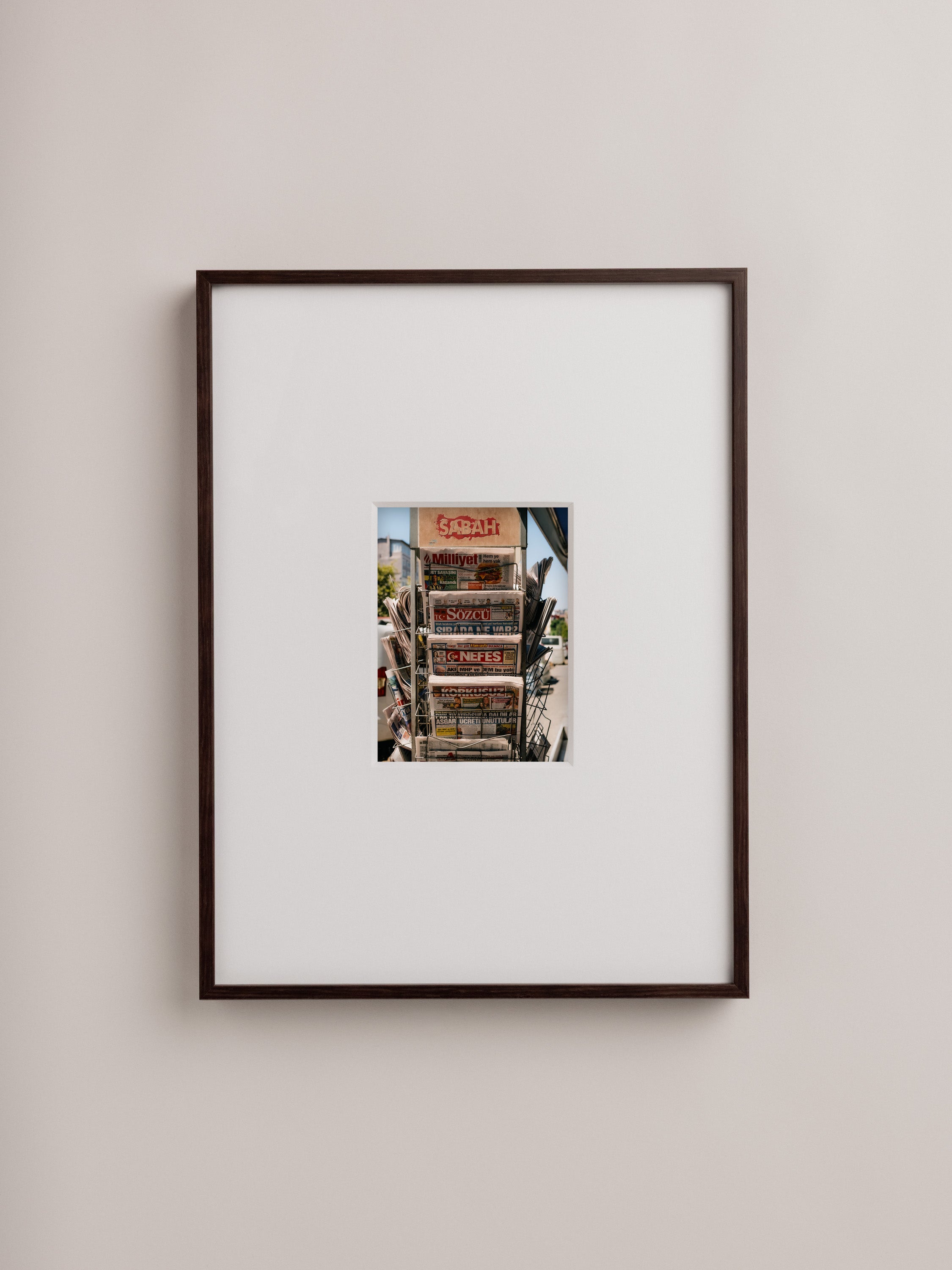 A photographic artwork documenting local Turkish newspapers arranged at a city kiosk. With museum-grade printing and a refined handcrafted frame, it adds a touch of everyday culture to your walls.